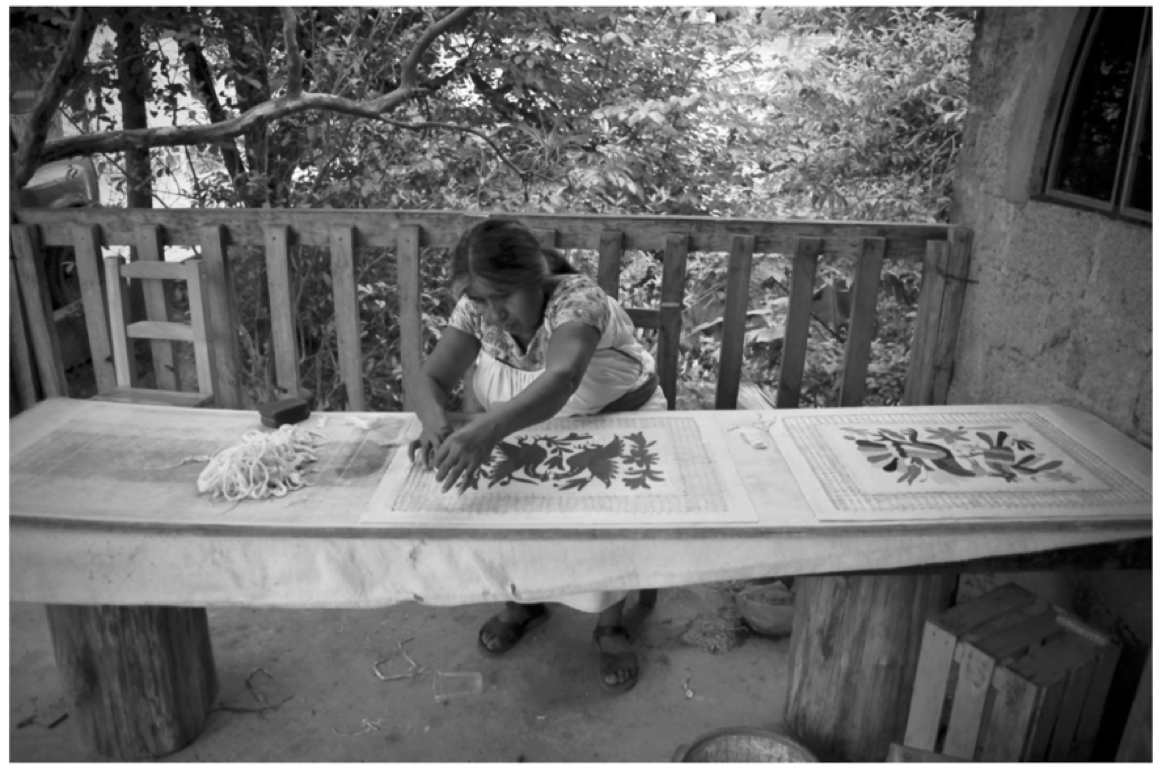 - Foto 1. Artesana otomí de San Pablito, Pahuatlán, elaborando papel amate con incrustaciones de Tenangos